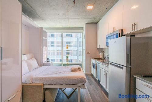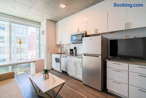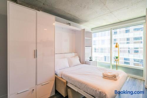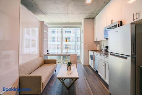 ✨ Why You’ll Love It: ✦ Prime Downtown location, walk to top attractions, dining, and nightlife ✦ Resort-style building amenities including pool, gym, and secure access ✦ Paid on-site parking available ✦ In-unit washer & dryer ✦ Ideal for business travellers, couples, and small groups 🛏 Sleep Comfortably ✦ Rest peacefully in a private bedroom featuring a plush queen-size bed and ample closet space. ✦ The living room has a sofa (not a sofa bed, but comfortable enough for one person to sleep). ✦ Enjoy the comfort and privacy of a full bathroom, stocked with fresh towels and essentials. 🛋 Lounge, Dine & Work ✦ Kick back in the stylish living area with a comfy sofa, 60” TV, and climate control for year-round comfort. ✦ Share meals or get some work done at the dedicated dining table and workspace, perfect for remote work or casual dining. 🍳 Cook & Dine with Ease ✦ The fully equipped kitchen has everything you need to prepare and enjoy meals at home, including major appliances, cookware, dishes, and more. 🧺 Laundry Made Simple ✦ No need to overpack enjoy the convenience of in-unit laundry with all the essentials included to keep you feeling fresh during your stay.