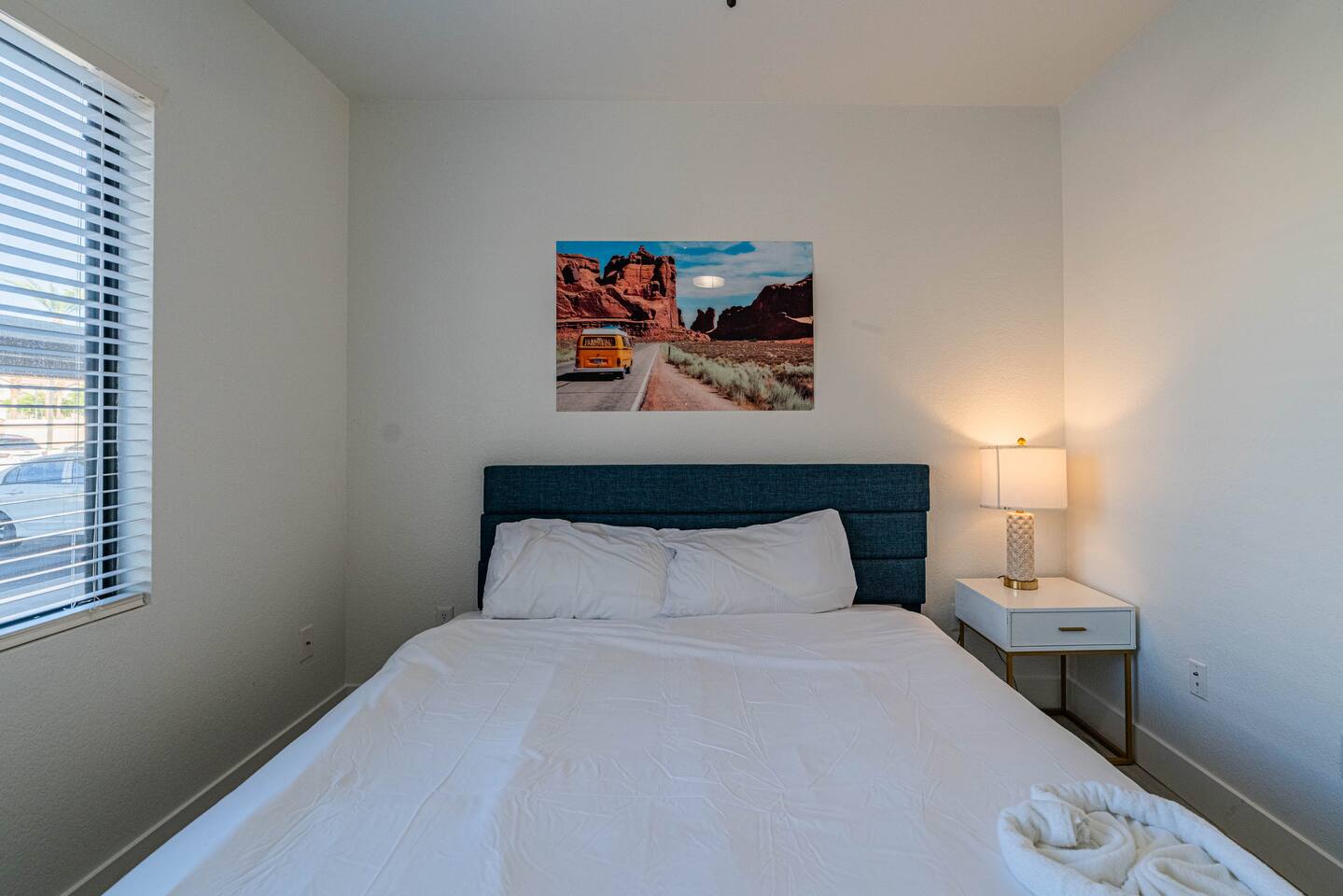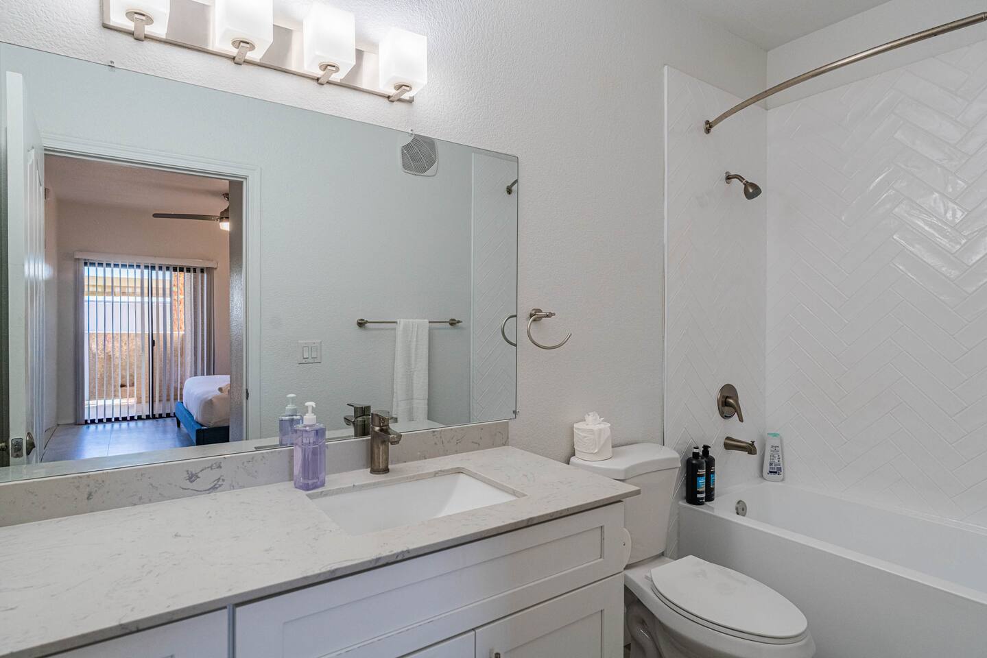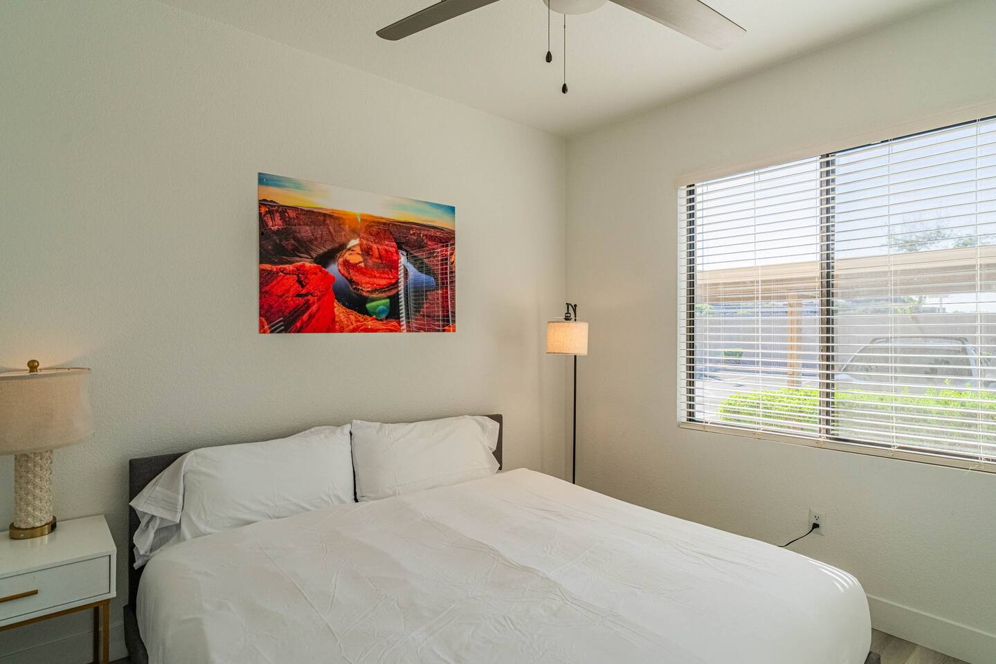 This thoughtfully designed 2-bedroom, 2-bath apartment is perfect for families, couples, business travelers, or anyone seeking more space and privacy during their stay. You'll enjoy: 🛏️ Two spacious bedrooms – Each room features plush (Queen beds or King beds), cozy linens, ample closet space, and relaxing vibes. Ideal for a restful night’s sleep after a day of exploring, working, or relaxing. 🚿 Two full bathrooms – No need to share! Both bathrooms are clean and modern, stocked with fresh towels, a hairdryer, and essential toiletries. Perfect for getting ready without the wait. 🍳 Fully equipped kitchen – Cook like you're at home with stainless steel appliances, quartz countertops, a full-size fridge with ice maker, oven, microwave, coffee maker, toaster, and all the cookware, dishes, and utensils you’ll need. Whether it’s a morning coffee or a full dinner, we’ve got you covered. 🛋️ Open-concept living and dining area – Designed for relaxation and connection. Enjoy a large comfy sofa, dining table, and tasteful decor that makes the space feel welcoming and elevated. 📺 Smart TV + fast WiFi – Stream your favorite shows, log into your Netflix account, or get some remote work done with strong, reliable internet. 🧺 In-unit washer & dryer – Pack light and stay fresh! Full-size appliances available for your convenience during longer stays. 🌅 Private patio or balcony – Enjoy your morning coffee or a quiet evening outside on your own private space. A great place to take in the Arizona sunshine 🌞 🌿 Bright and airy layout – Natural light fills the space through oversized windows, complemented by high ceilings, modern lighting, and hardwood-style flooring throughout. 🧠 Smart home features – From USB charging ports to modern lighting, ceiling fans, and central AC/heating, the unit is equipped for a seamless, comfortable stay. 🪑 Optional workspace setup – Ask us if you need a dedicated desk or work-from-home setup.