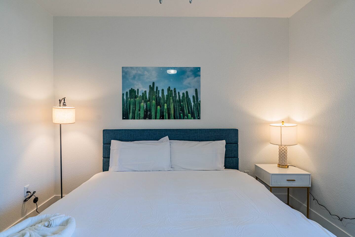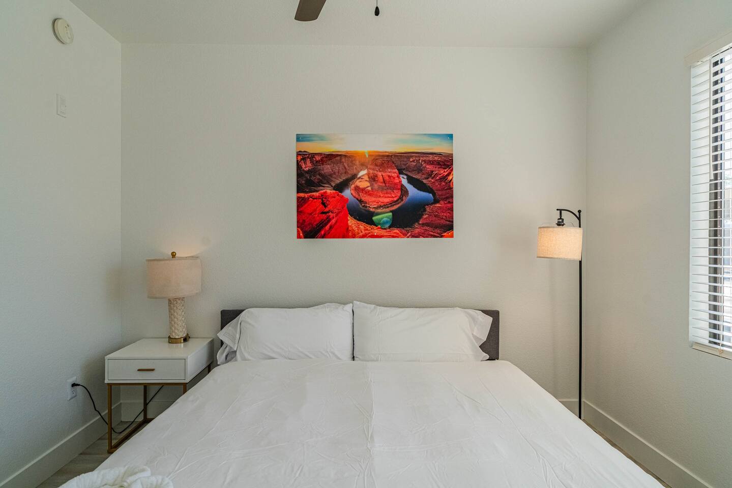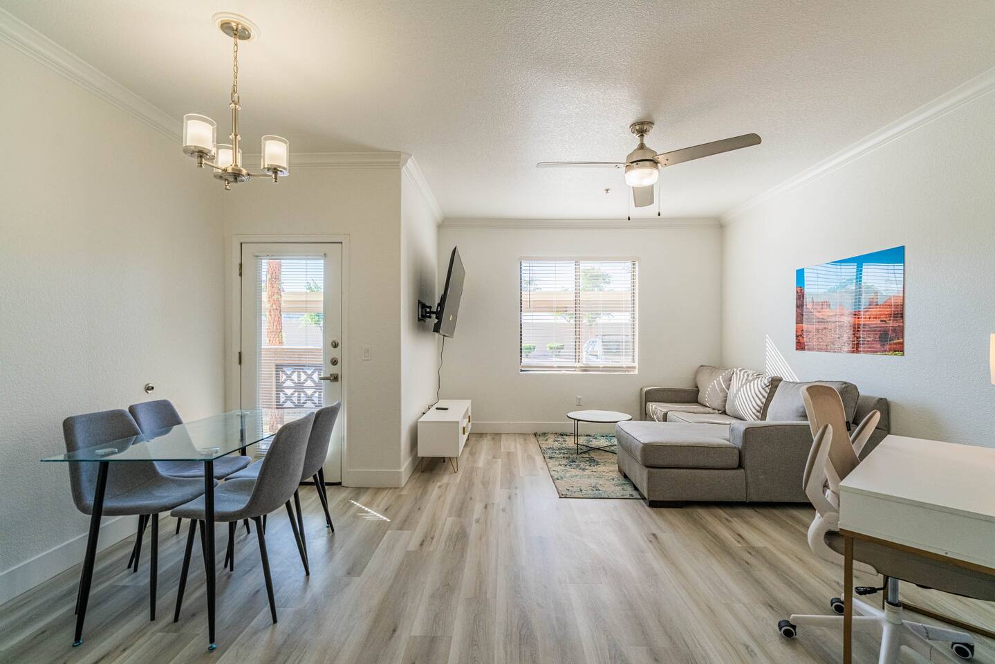 This thoughtfully designed 2-bedroom, 2-bath apartment is perfect for families, couples, business travelers, or anyone seeking more space and privacy during their stay. You'll enjoy: 🛏️ Two spacious bedrooms – Each room features plush (Queen beds or King beds), cozy linens, ample closet space, and relaxing vibes. Ideal for a restful night’s sleep after a day of exploring, working, or relaxing. 🚿 Two full bathrooms – No need to share! Both bathrooms are clean and modern, stocked with fresh towels, a hairdryer, and essential toiletries. Perfect for getting ready without the wait. 🍳 Fully equipped kitchen – Cook like you're at home with stainless steel appliances, quartz countertops, a full-size fridge with ice maker, oven, microwave, coffee maker, toaster, and all the cookware, dishes, and utensils you’ll need. Whether it’s a morning coffee or a full dinner, we’ve got you covered. 🛋️ Open-concept living and dining area – Designed for relaxation and connection. Enjoy a large comfy sofa, dining table, and tasteful decor that makes the space feel welcoming and elevated. 📺 Smart TV + fast WiFi – Stream your favorite shows, log into your Netflix account, or get some remote work done with strong, reliable internet. 🧺 In-unit washer & dryer – Pack light and stay fresh! Full-size appliances available for your convenience during longer stays. 🌅 Private patio or balcony – Enjoy your morning coffee or a quiet evening outside on your own private space. A great place to take in the Arizona sunshine 🌞 🌿 Bright and airy layout – Natural light fills the space through oversized windows, complemented by high ceilings, modern lighting, and hardwood-style flooring throughout. 🧠 Smart home features – From USB charging ports to modern lighting, ceiling fans, and central AC/heating, the unit is equipped for a seamless, comfortable stay. 🪑 Optional workspace setup – Ask us if you need a dedicated desk or work-from-home setup.