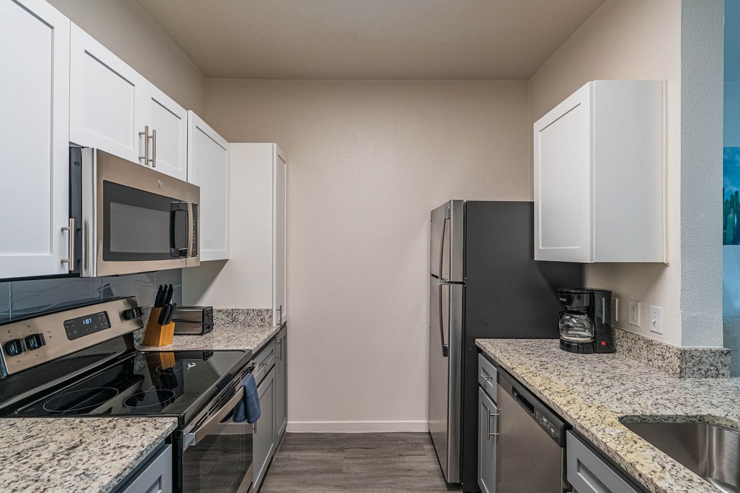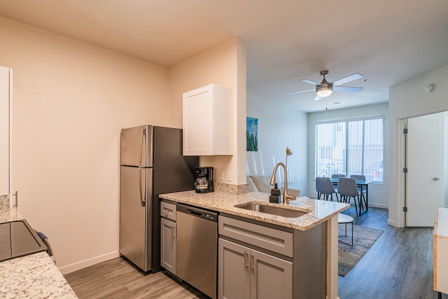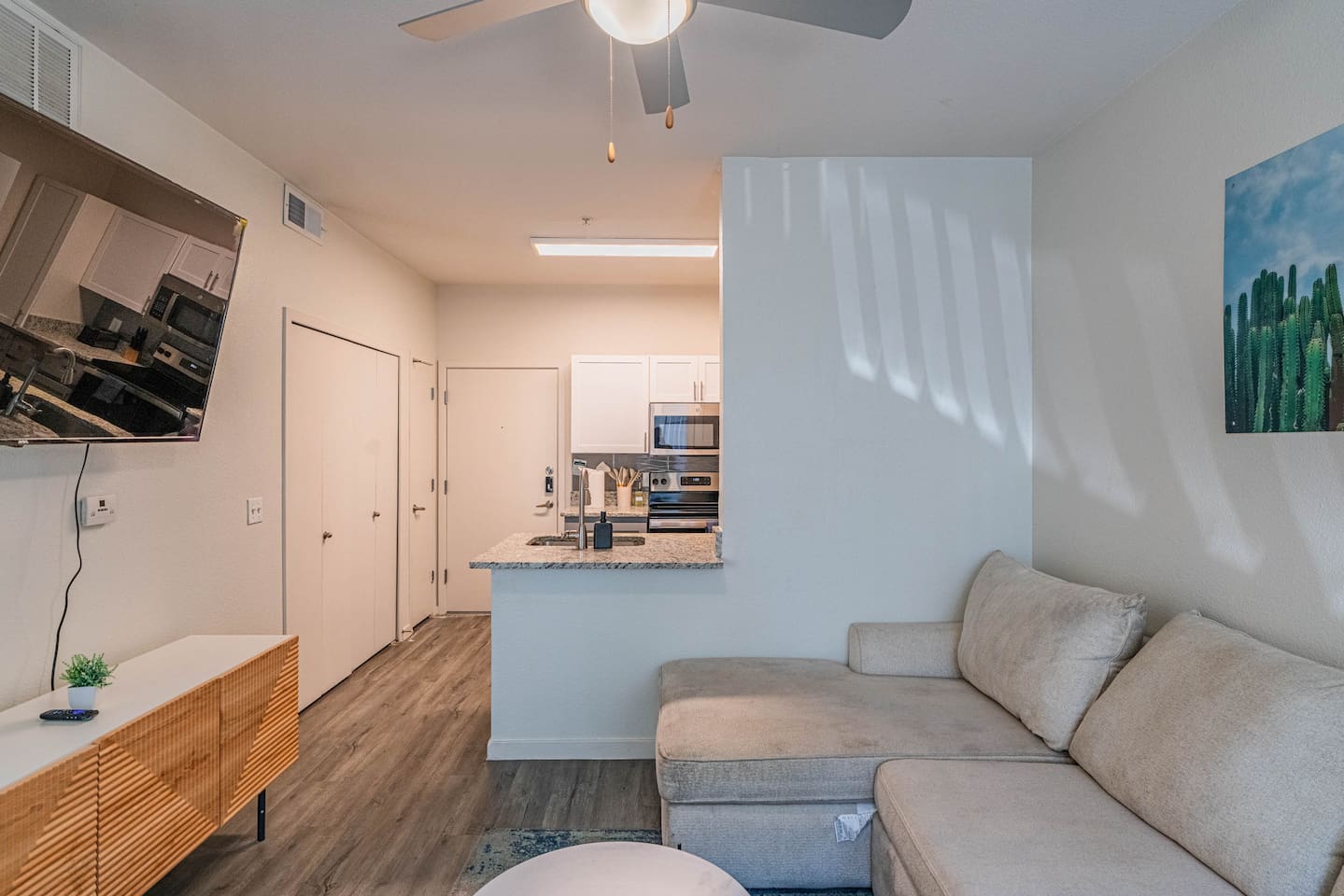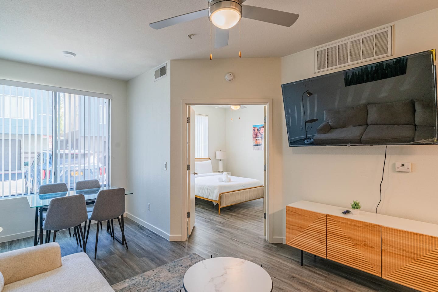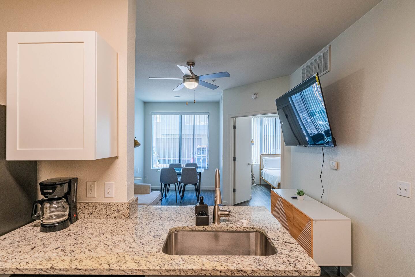 ✨ Why You’ll Love It ✦ Modern 1 bedroom layout with thoughtful design ✦ Resort-style amenities in a secure, gated community ✦ Free parking included ✦ Fast WiFi throughout the home ✦ Ideal for solo travelers, couples & business stays ✦ On-site EV charging available 🛏 Relax & Sleep Comfortably ✦ Settle into a clean and inviting 1 bedroom featuring a plush Queen bed, fresh linens, and plenty of space to unwind after a busy day. 🛋 Lounge, Dine & Recharge ✦ Relax with your favorite shows on the 65" Smart TV, enjoy a meal at the dining area, or simply stretch out in your peaceful private space. Designed with comfort in mind, this unit has everything you need to feel right at home. 🍽 Cook & Dine with Ease ✦ The well-equipped kitchenette includes essential appliances, cookware, and dining basics. Perfect for preparing breakfast, a light meal, or a simple snack. 🧺 Stay Fresh with Ease ✦ Community laundry facilities make it simple to wash and refresh clothes during longer stays.