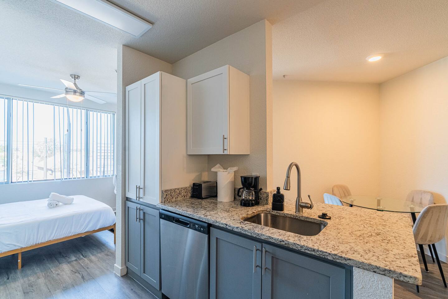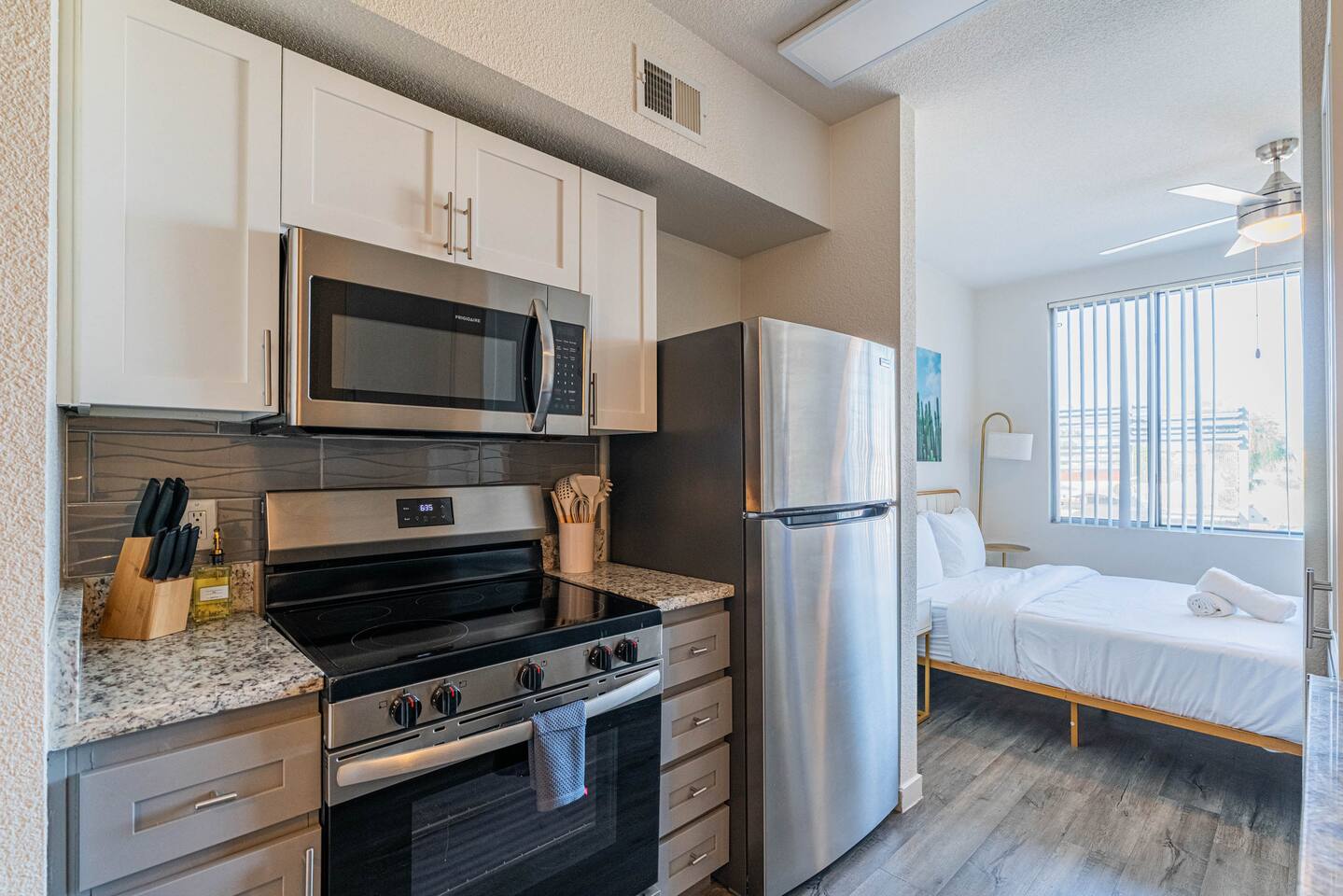 โ About This Space Experience resort-style living in this modern studio apartment at The Access Apartments in Tempe, Arizona, a stylish desert oasis with every comfort at your fingertips. ๐๏ธ Bedroom Area Relax in a queen-sized bed with premium bedding and soft linens for a peaceful nightโs sleep. ๐๏ธ Living Area Unwind in the cozy lounge space with a Smart TV for streaming and high-speed Wi-Fi perfect for work or leisure. ๐ณ Full Kitchen The fully equipped kitchen features a refrigerator, stove, oven, microwave, and coffee maker, complete with cookware, dishes, and utensils for home-cooked meals. ๐งบ In-Unit Laundry A washer and dryer are conveniently included in your unit for longer, worry-free stays. ๐ Bathroom with Bathtub Refresh and recharge in your modern full bathroom with a bathtub, stocked with soft towels and toiletries for your comfort. ๐ด Resort-Style Community Amenities Enjoy full access to the luxurious community spaces at The Access Apartments, including: ๐ฆ Resort-style swimming pool ๐ช Modern fitness center & spin room โจ๏ธ Outdoor spa and gas firepit ๐ฝ๏ธ Community summer kitchen & grilling stations ๐ Rooftop basketball court ๐น๏ธ Resident clubhouse with game room & lounge ๐ถ Bark Park for your furry friends (pet-friendly units only) ๐ Electric vehicle charging stations โ Starbucks coffee bar ๐ฆ Amazon package lockers ๐งบ On-site vending machines ๐งฝ Hotel-inspired cleaning & concierge services (by Spruce) ๐ Controlled access gate and free parking