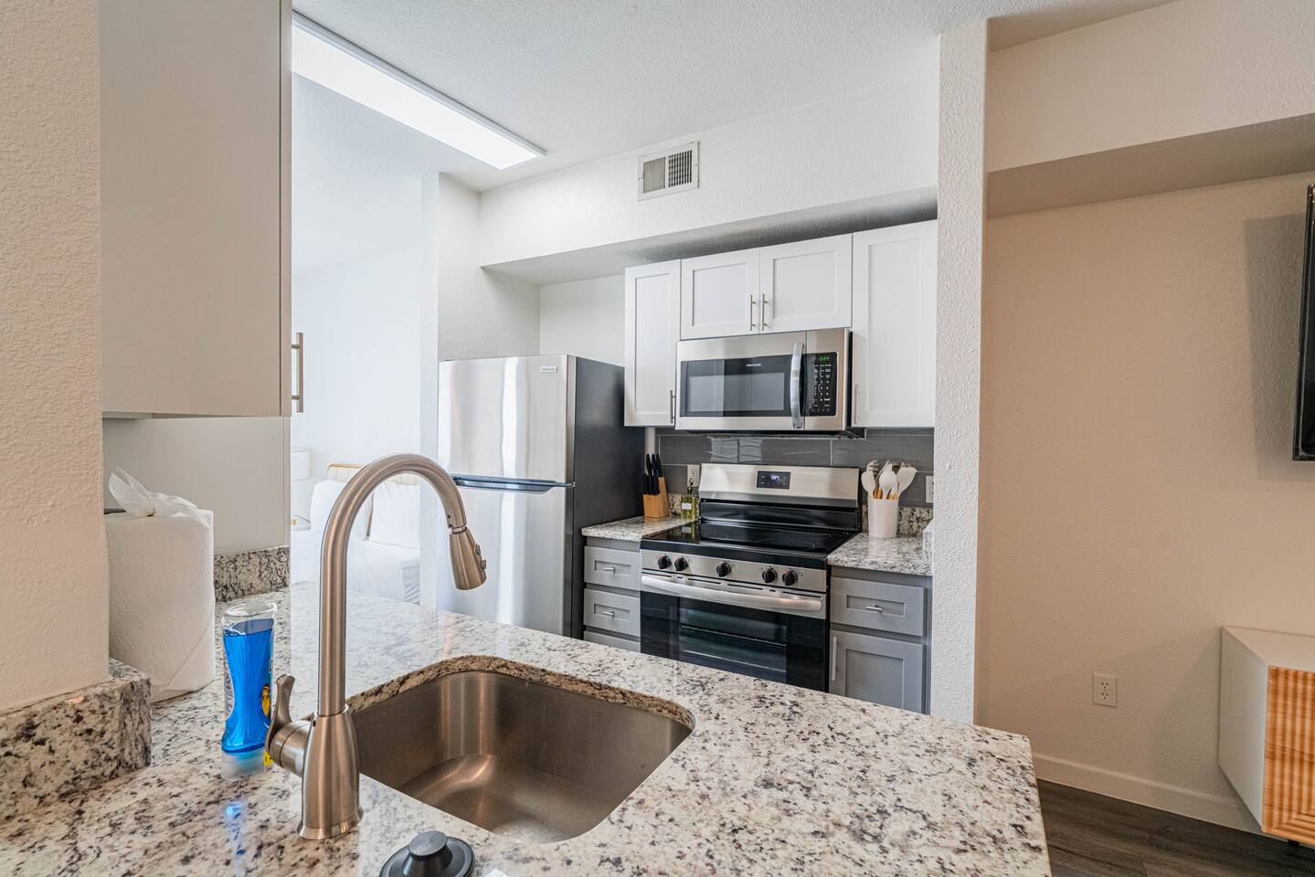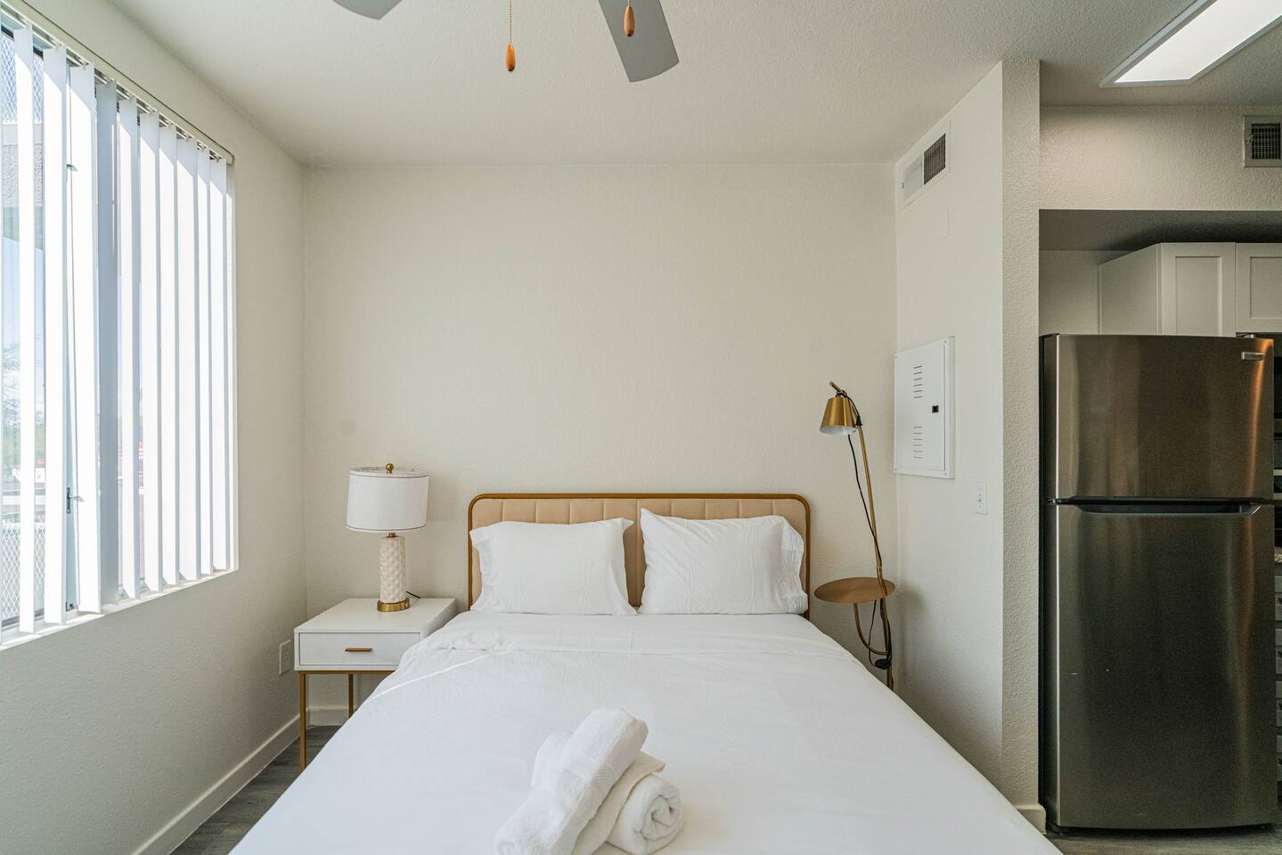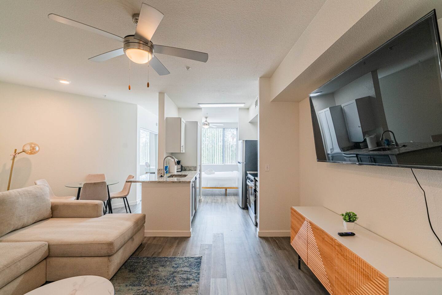 ✨ Why You’ll Love It ✦ Modern studio layout with thoughtful design ✦ Resort-style amenities in a secure, gated community ✦ Free parking included ✦ Fast WiFi throughout the home ✦ Ideal for solo travelers, couples & business stays ✦ On-site EV charging available 🛏 Relax & Sleep Comfortably ✦ Settle into a clean and inviting studio featuring a plush Queen bed, fresh linens, and plenty of space to unwind after a busy day. 🛋 Lounge, Dine & Recharge ✦ Relax with your favorite shows on the 65" Smart TV, enjoy a meal at the dining area, or simply stretch out in your peaceful private space. Designed with comfort in mind, this studio has everything you need to feel right at home. 🍽 Cook & Dine with Ease ✦ The well-equipped kitchenette includes essential appliances, cookware, and dining basics. Perfect for preparing breakfast, a light meal, or a simple snack. 🧺 Stay Fresh with Ease ✦ Community laundry facilities make it simple to wash and refresh clothes during longer stays.