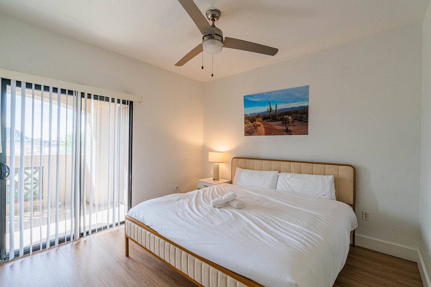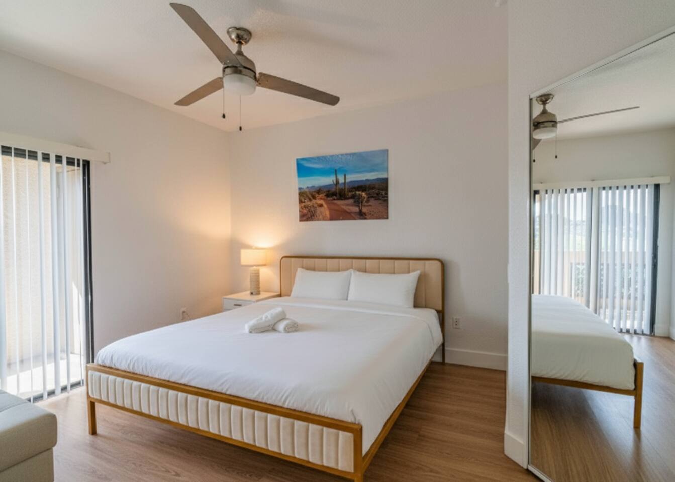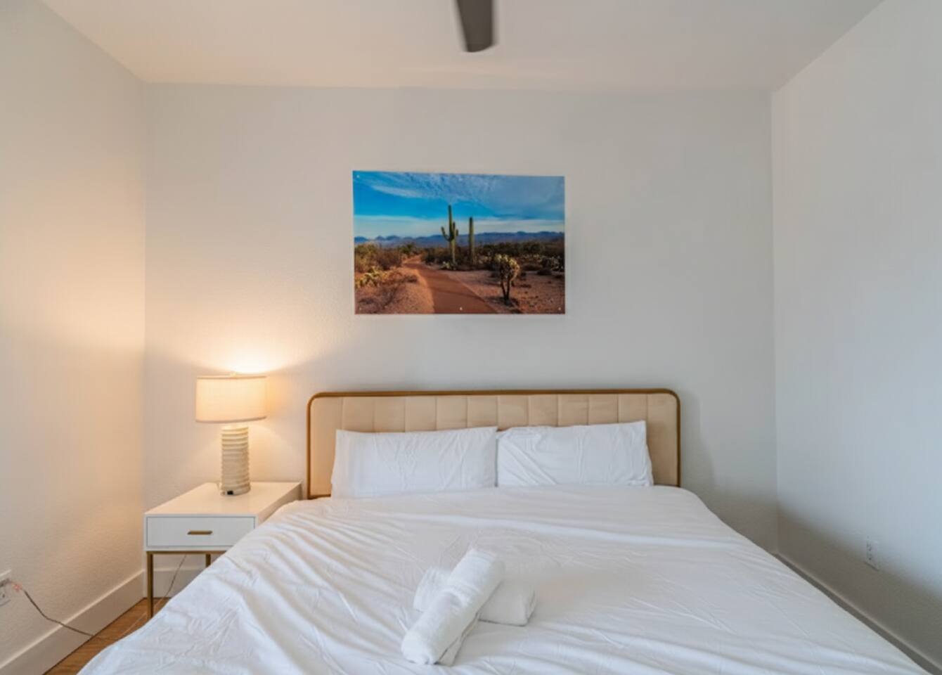 This thoughtfully designed 2-bedroom, 2-bath apartment is perfect for families, couples, business travelers, or anyone seeking more space and privacy during their stay. You'll enjoy: 🛏️ Two spacious bedrooms – Each room features plush (Queen beds or King beds), cozy linens, ample closet space, and relaxing vibes. Ideal for a restful night’s sleep after a day of exploring, working, or relaxing. 🚿 Two full bathrooms – No need to share! Both bathrooms are clean and modern, stocked with fresh towels, a hairdryer, and essential toiletries. Perfect for getting ready without the wait. 🍳 Fully equipped kitchen – Cook like you're at home with stainless steel appliances, quartz countertops, a full-size fridge with ice maker, oven, microwave, coffee maker, toaster, and all the cookware, dishes, and utensils you’ll need. Whether it’s a morning coffee or a full dinner, we’ve got you covered. 🛋️ Open-concept living and dining area – Designed for relaxation and connection. Enjoy a large comfy sofa, dining table, and tasteful decor that makes the space feel welcoming and elevated. 📺 Smart TV + fast WiFi – Stream your favorite shows, log into your Netflix account, or get some remote work done with strong, reliable internet. 🧺 In-unit washer & dryer – Pack light and stay fresh! Full-size appliances available for your convenience during longer stays. 🌅 Private patio or balcony – Enjoy your morning coffee or a quiet evening outside on your own private space. A great place to take in the Arizona sunshine 🌞 🌿 Bright and airy layout – Natural light fills the space through oversized windows, complemented by high ceilings, modern lighting, and hardwood-style flooring throughout. 🧠 Smart home features – From USB charging ports to modern lighting, ceiling fans, and central AC/heating, the unit is equipped for a seamless, comfortable stay. 🪑 Optional workspace setup – Ask us if you need a dedicated desk or work-from-home setup.