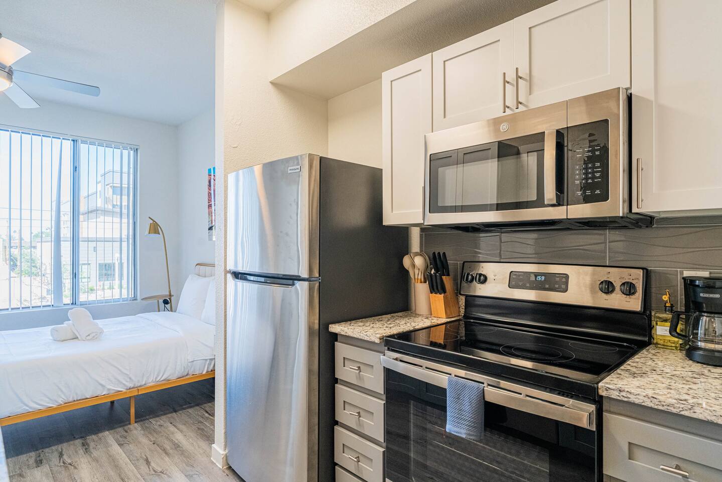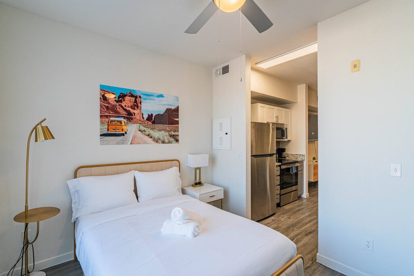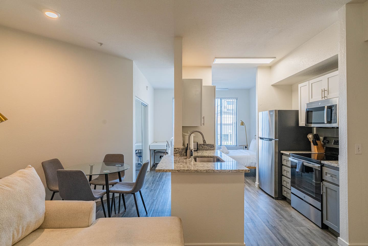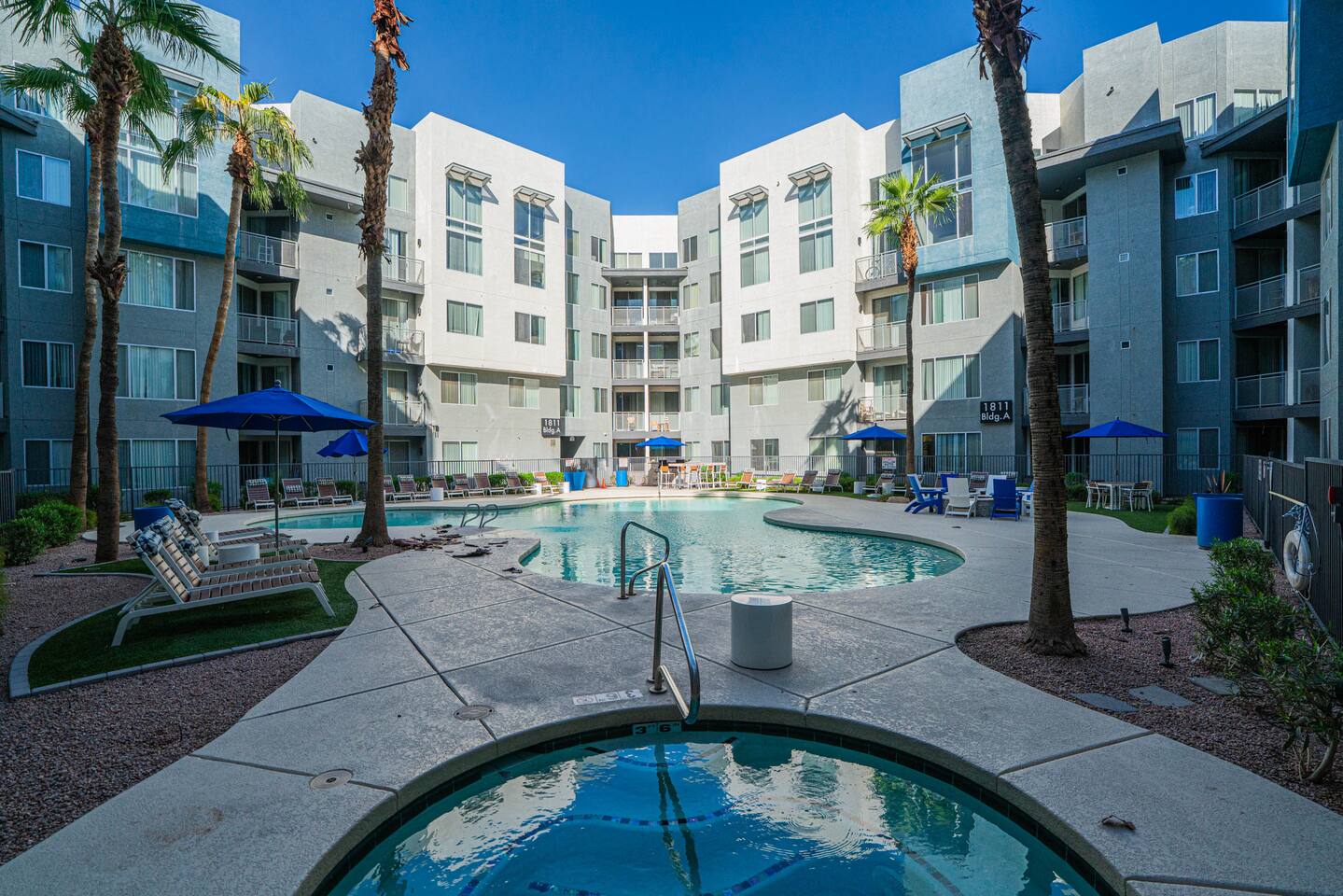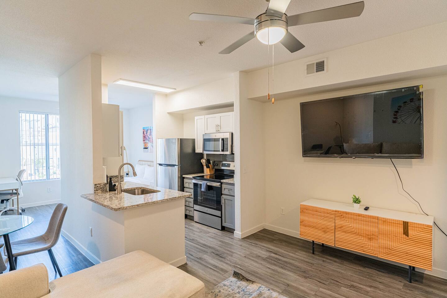 ✨ Why You’ll Love It ✦ Modern studio layout with thoughtful design ✦ Resort-style amenities in a secure, gated community ✦ Free parking included ✦ Fast WiFi throughout the home ✦ Ideal for solo travelers, couples & business stays ✦ On-site EV charging available 🛏 Relax & Sleep Comfortably ✦ Settle into a clean and inviting studio featuring a plush Queen bed, fresh linens, and plenty of space to unwind after a busy day. 🛋 Lounge, Dine & Recharge ✦ Relax with your favorite shows on the 65" Smart TV, enjoy a meal at the dining area, or simply stretch out in your peaceful private space. Designed with comfort in mind, this studio has everything you need to feel right at home. 🍽 Cook & Dine with Ease ✦ The well-equipped kitchenette includes essential appliances, cookware, and dining basics. Perfect for preparing breakfast, a light meal, or a simple snack. 🧺 Stay Fresh with Ease ✦ Community laundry facilities make it simple to wash and refresh clothes during longer stays.