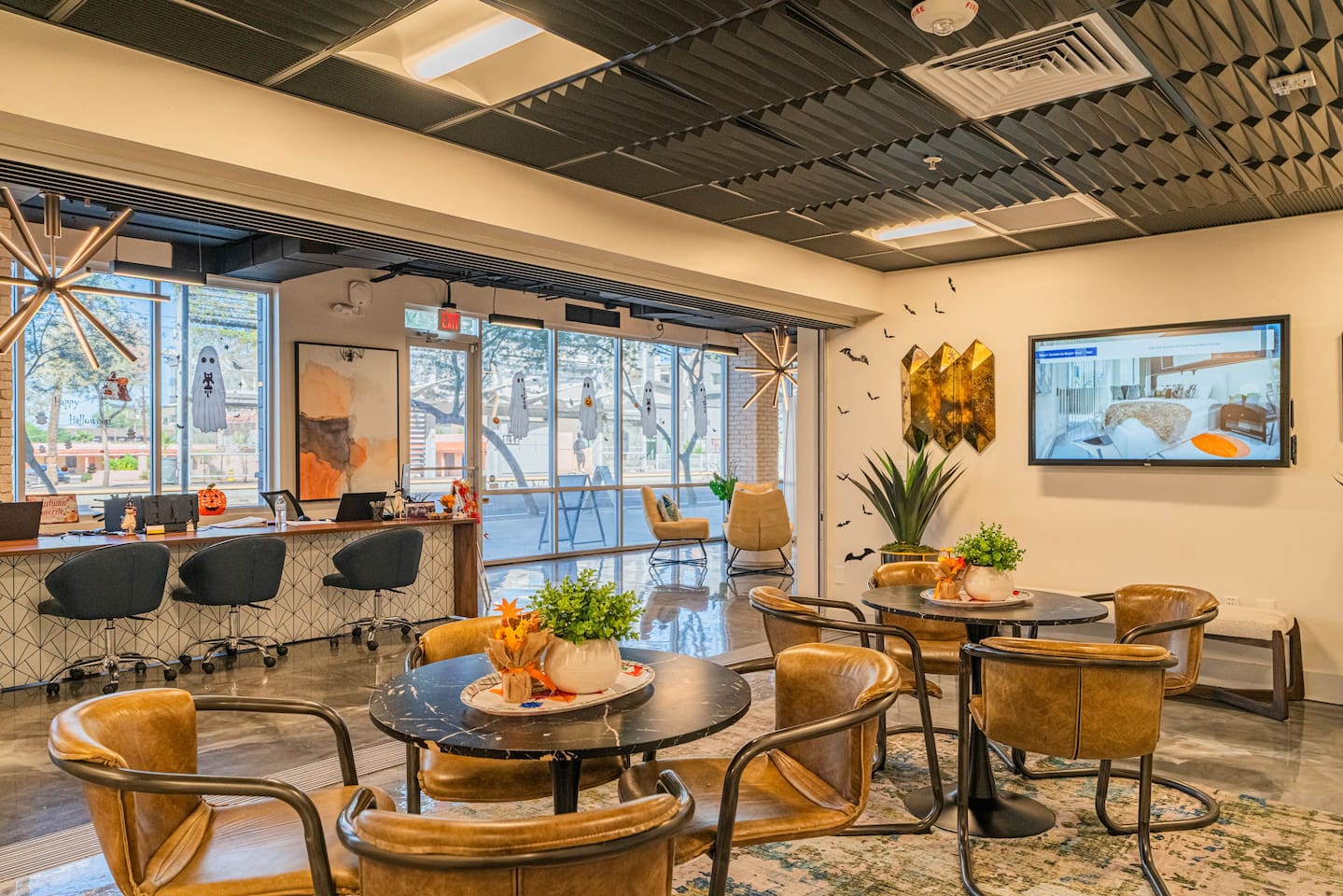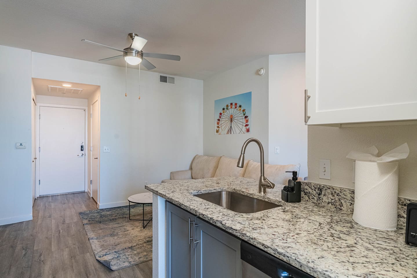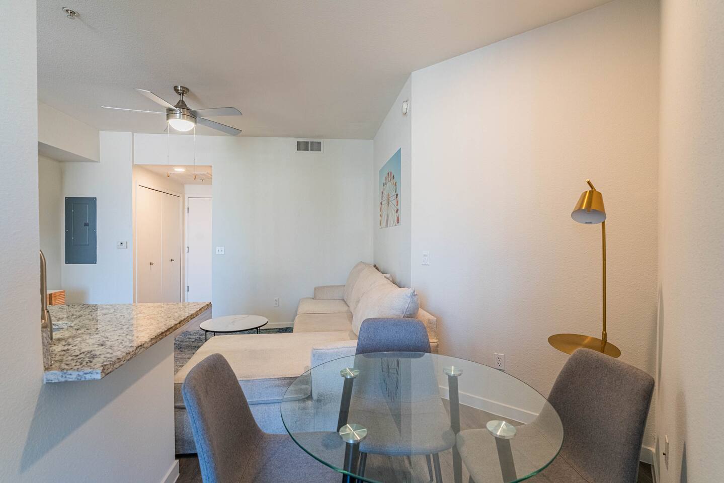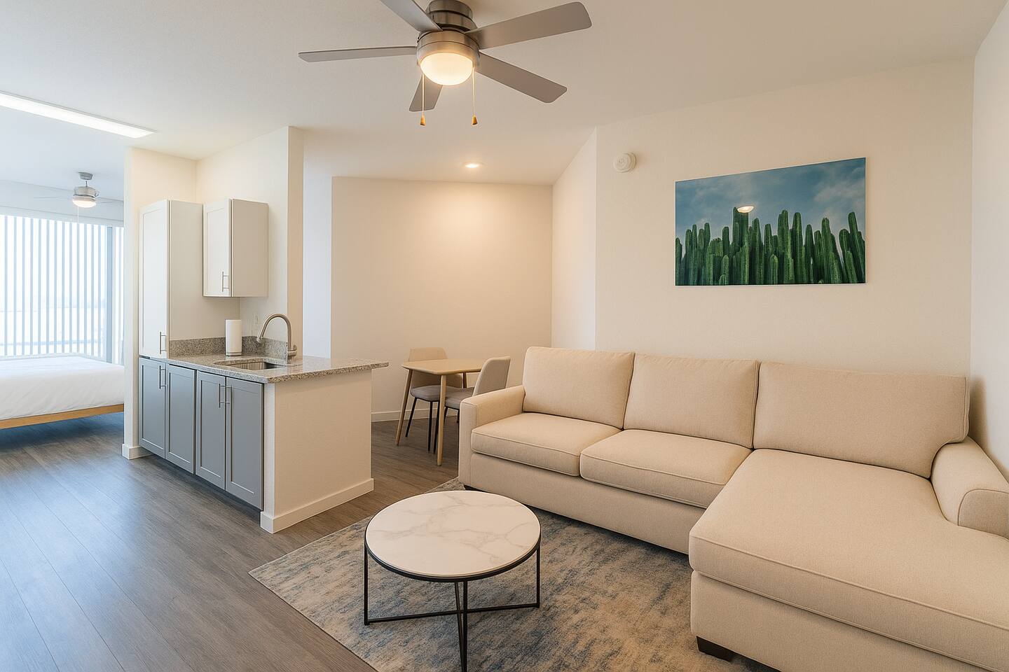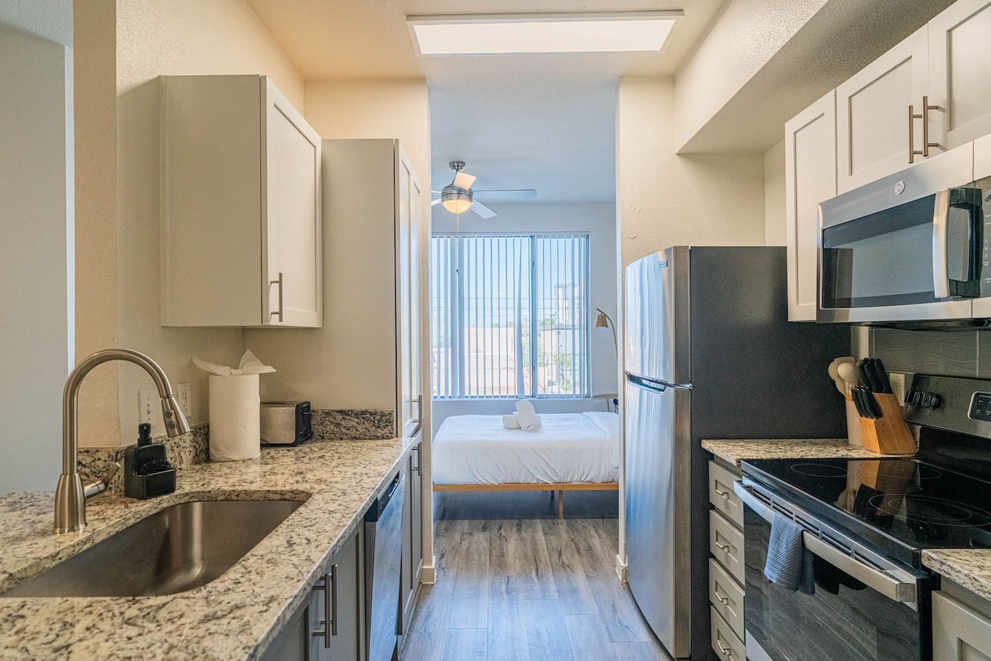 ✨ Why You’ll Love It ✦ Modern studio layout with thoughtful design ✦ Resort-style amenities in a secure, gated community ✦ Free parking included ✦ Fast WiFi throughout the home ✦ Ideal for solo travelers, couples & business stays ✦ On-site EV charging available 🛏 Relax & Sleep Comfortably ✦ Settle into a clean and inviting studio featuring a plush Queen bed, fresh linens, and plenty of space to unwind after a busy day. 🛋 Lounge, Dine & Recharge ✦ Relax with your favorite shows on the 65" Smart TV, enjoy a meal at the dining area, or simply stretch out in your peaceful private space. Designed with comfort in mind, this studio has everything you need to feel right at home. 🍽 Cook & Dine with Ease ✦ The well-equipped kitchenette includes essential appliances, cookware, and dining basics. Perfect for preparing breakfast, a light meal, or a simple snack. 🧺 Stay Fresh with Ease ✦ Community laundry facilities make it simple to wash and refresh clothes during longer stays.